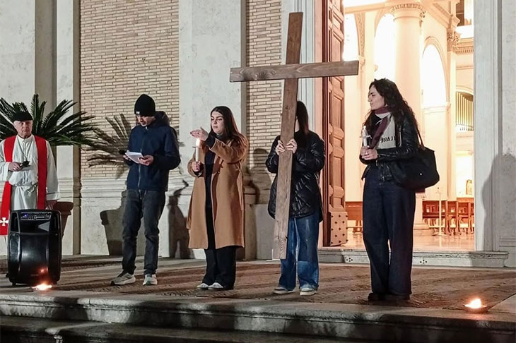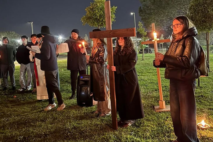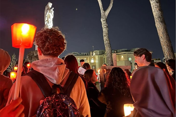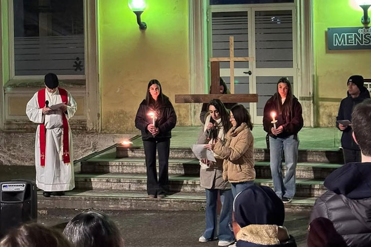 Un silenzio che si è fatto canto, preghiera e cammino comune nella sera del 24 marzo quando, partendo dalla statua del Sacro Cuore nella zona dell’eliporto, studentesse e studenti, guidati da Mons. Giuliodori insieme agli Assistenti pastorali, hanno fatto dell’intera Sede una via dolorosa, fermandosi nelle tappe rappresentative della Via Crucis, in altrettanti luoghi significativi, per arrivare fino alla statua di Giovanni Paolo II, nel piazzale antistante il Policlinico Gemelli.