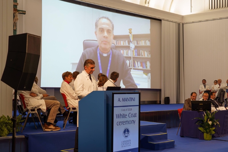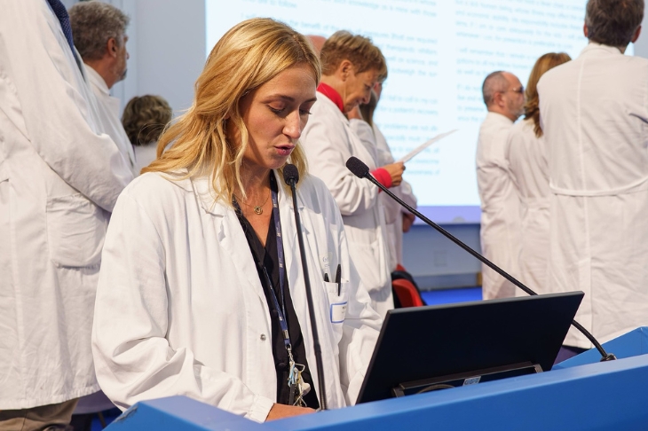 La Coating ceremony, la solenne cerimonia di vestizione degli studenti con la simbolica consegna del camice da parte dei docenti del Corso, è stata introdotta dalle parole del professor Giovanni Gambassi, presidente del corso di laurea in Medicine and Surgery: «Da questo momento in avanti, studiare Medicina non sarà più solo incamerare conoscenze, e per diventare veri medici non basteranno solo buoni voti. D’ora in poi si tratta di lavorare per uno scopo più grande: i vostri camici bianchi rappresentano un simbolo della fiducia che i pazienti ripongono in voi ogni giorno».