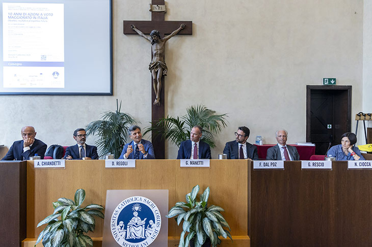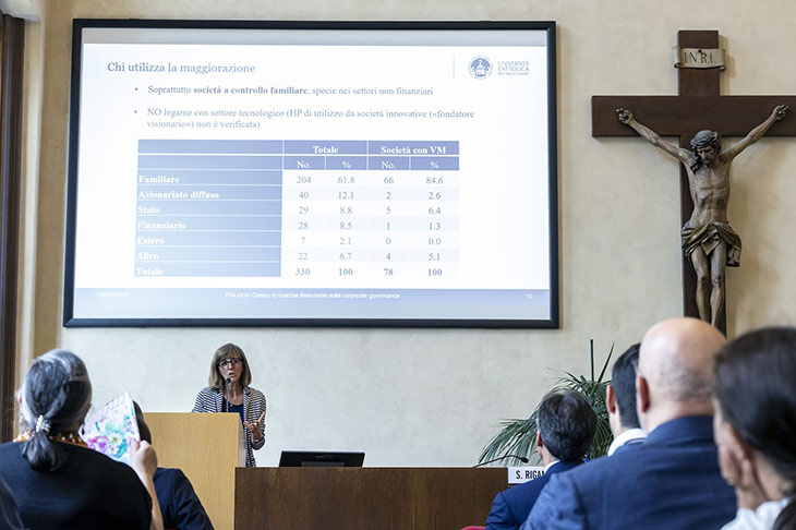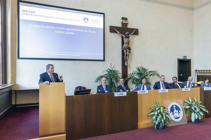È stata presentata martedì 9 settembre la ricerca “10 anni di azioni a voto maggiorato in Italia” curata dai docenti Massimo Belcredi, Silvia Rigamonti e Andrea Signori nell’ambito del Centro di ricerche finanziarie sulla corporate governance (Fin-Gov). Dopo i saluti istituzionali della preside della Facoltà di Economia Antonella Occhino e del direttore del Dipartimento di Scienze dell’economia e della gestione aziendale Mario Anolli, Silvia Rigamonti, docente di Finanza aziendale, ha illustrato i risultati dell’analisi. Discussant della presentazione è stato Marco Maugeri, docente di Diritto commerciale all’Università di Roma Tre. L’incontro è proseguito con una tavola rotonda che, moderata dal docente di Diritto commerciale dell’Ateneo Duccio Regoli, ha avuto come relatori Alberto Chiandetti, Equity Portfolio Manager di Fidelity International, Nicoletta Ciocca, docente di Diritto commerciale all’Università di Roma Tor Vergata, Federico Dal Poz, Chief Legal Officer di Amplifon, Guglielmo Manetti, AD di Intermonte, Ulisse Spada, General Counsel di Diasorin, Giuseppe Rescio, docente di Diritto commerciale all’Università Cattolica. Ha concluso i lavori Massimo Belcredi, direttore del Centro di ricerche Fin-Gov.