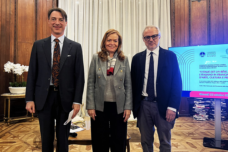 L’Italia è un sogno che ritorna incessantemente, ricordava la poetessa Anna Achmatova. «In Francia quel sogno è oggi pratica concreta: l’italiano è una lingua-ponte che connette eredità e futuro, identità e cooperazione» e, proprio per questo, «investire sull’italiano significa coltivare un bene comune europeo capace di generare conoscenza, cittadinanza culturale e sviluppo condiviso». A dirlo è Maria Teresa Zanola, docente di Linguistica francese e direttrice scientifica dell'Osservatorio di terminologie e politiche linguistiche – OTPL dell’Università Cattolica del Sacro Cuore, nella cornice del Consolato Generale d’Italia in Francia. Dove la community Alumni dell’Università Cattolica del Sacro Cuore, in collaborazione con il Consolato Generale stesso e con l’Accademia della Crusca, di cui la professoressa Zanola è accademica corrispondente, ha promosso giovedì 23 ottobre un incontro dedicato al ruolo della lingua italiana come strumento di dialogo interculturale, creativo e professionale tra Italia e Francia.