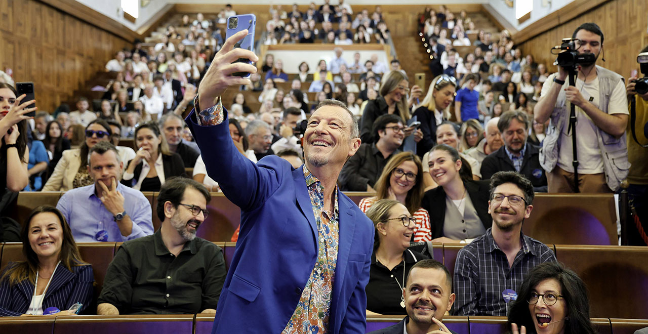 Amadeus si è raccontato davanti agli studenti partendo dalla sua esperienza in radio, «una palestra quotidiana» come lui stesso l’ha definita. E poi «allora non si studiava per diventare professionisti della tv. Vedevi Mike Bongiorno e Pippo Baudo, sognavi di poter un giorno fare qualcosa di simile senza avere un piano B. Se hai un sogno, insisti e hai sete di imparare, magari questa cosa accade». Una lezione per gli studenti che non conosce età.