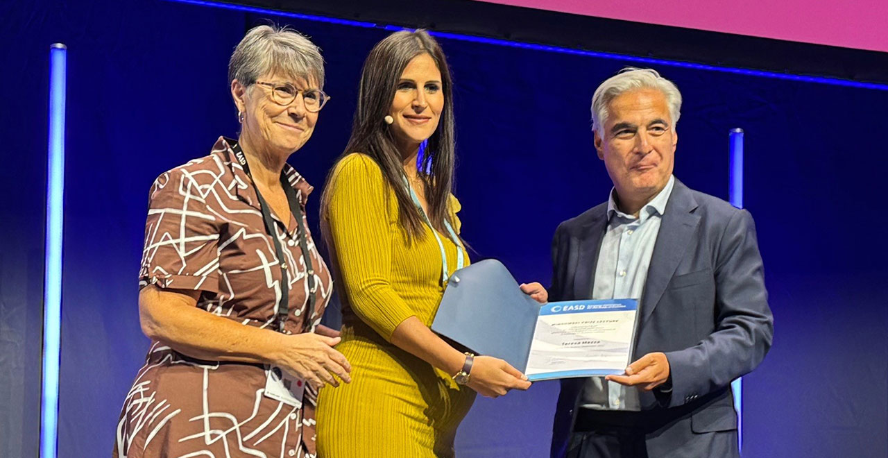 Nella foto, da sinistra: Chantal Mathieu, MD, PhD Katholieke Universiteit Leuven (KULeuven), presidente EASD, Belgium chairwoman della sessione del Premio, la dottoressa Teresa Mezza e Arash Tahbaz, vice president and International Therapy Area Leader Cardiometabolic Health Eli Lilly