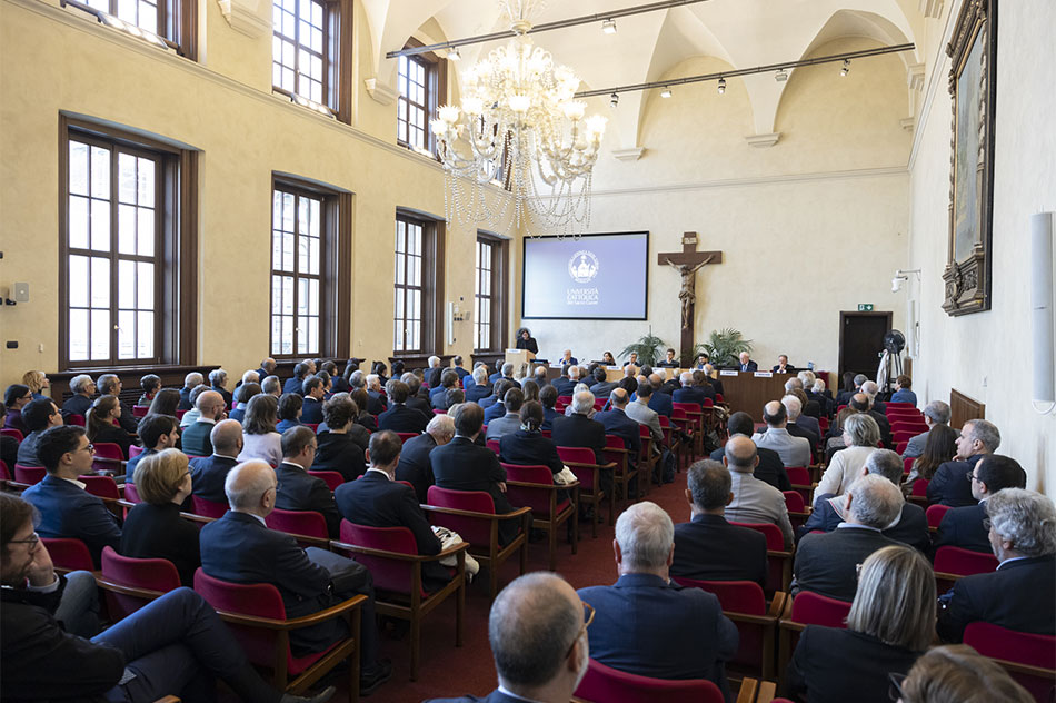 «È stato studioso fine e rigoroso, docente appassionato e mai banale, professionista acuto e apprezzato, rettore equilibrato e brillante». Con queste parole Elena Beccalli, rettore dell’Università Cattolica del Sacro Cuore, ha introdotto venerdì 10 ottobre il convegno in ricordo del professor Franco Anelli. Ordinario di Diritto privato nella Facoltà di Giurisprudenza, dove ha svolto una lunga e stimata attività accademica, dal 2013 al 2024 il professor Anelli ha ricoperto il ruolo di rettore dell’Ateneo. Un’iniziativa partecipata e densa di commozione che ha avuto uno dei suoi momenti più toccanti nella consegna della medaglia commemorativa - realizzata dalla Conferenza dei rettori delle università italiane (Crui) - alla signora Lucia Ambroggi, mamma di Franco Anelli, da parte della professoressa Giovanna Iannantuoni, già presidente Crui.