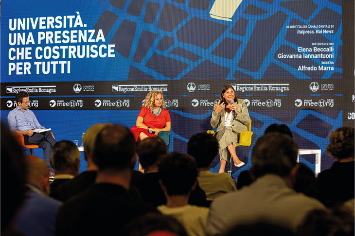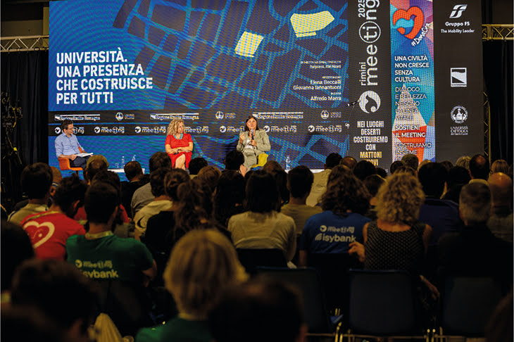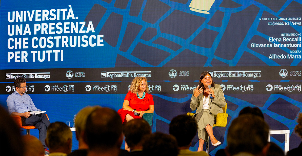 «Occorre ribadire con forza che studentesse e studenti non sono utenti ai quali offrire un servizio, ma persone animate dalla speranza di vivere un’esperienza educativa»: è uno dei passaggi chiave del contributo offerto dal Rettore dell’Università Cattolica del Sacro Cuore, Elena Beccalli, nel corso dell’incontro su “Università. Una presenza che costruisce per tutti”, svoltosi sabato 23 agosto al Meeting di Rimini. Moderate da Alfredo Marra, docente di Diritto amministrativo all’Università di Milano Bicocca, la professoressa Beccalli e la presidente della CRUI (Conferenza dei Rettori delle Università Italiane) Giovanna Iannantuoni hanno risposto alle domande rivolte loro da un gruppo di giovani universitari provenienti da diversi Atenei. Numerosi gli spunti di riflessione emersi da un dibattito scaturito dalla consapevolezza delle molteplici criticità con cui il sistema universitario è chiamato a confrontarsi. Le modalità di insegnamento e condivisione del sapere, anzitutto. «Credo che sia giunto il momento di superare la distinzione tra didattica tradizionale e didattica innovativa, tra lezioni in presenza e lezioni online», ha affermato il Rettore Beccalli, aggiungendo che «una didattica a distanza ben progettata può essere un modo per “aprire l’università”. L'essenziale – ha ripetuto – è che l’università stessa non si trasformi in una fabbrica anonima di laureati, come accade quando l’educazione si piega alle logiche del profitto». Va inquadrata in questo contesto la proposta di un Patto educativo per le nuove tecnologie e l’Intelligenza Artificiale lanciato dalla professoressa Beccalli fin dal discorso inaugurale dell’anno accademico 2024-2025.