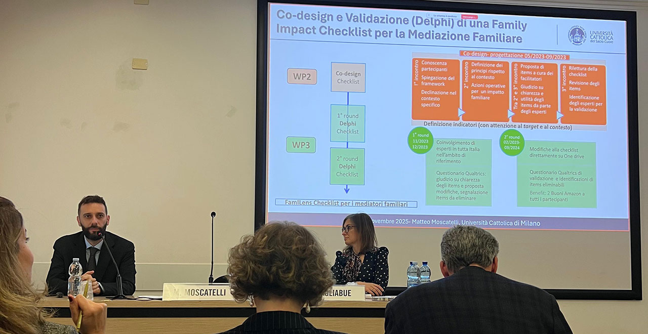 «Una delle linee di ricerca del progetto è quella della mediazione familiare, scelta sia per l’incidenza di divorzi e separazioni, sia perché oggi si parla di una “modernità esplosiva”, evidenziando i rischi della escalation del conflitto nella nostra società – ha detto il ricercatore di Sociologia Matteo Moscatelli che ha presentato i primi esiti del Progetto insieme con la psicologa Semira Tagliabue –. Abbiamo   cercato di creare uno strumento di valutazione riflessiva sulle relazioni in presenza del figlio. L’accordo di mediazione, infatti, non deve solo essere efficace per i partner e il loro benessere individuale, ma produrre un reale benessere relazionale. La checklist di impatto familiare serve proprio a osservare gli effetti dei gesti del mediatore sulle relazioni e, dato il suo valore, questo metodo di valutazione  sarà utilizzato anche in un modulo del master in Mediazione familiare e comunitaria promosso dall’Alta Scuola di Psicologia Agostino Gemelli.