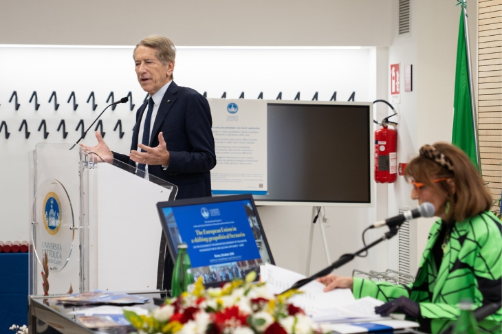 «Stiamo vivendo in Europa, e non solo, un periodo di incertezza, polarizzazione e frammentazione, un periodo molto sfidante: pensiamo alla Eastern Europe, al Middle East, a Gaza, Libano, al Sudan, all’Africa. Questi non sono conflitti regionali: essi hanno una dimensione globale e influenzano il resto del mondo, senza dimenticare le questioni economiche e ambientali, le nuove sfide poste dall’Intelligenza Artificiale, i problemi demografici. Da tutto questo - ha concluso - nasce la necessità ad un sempre maggiore impegno verso la pace e la sicurezza internazionale, attraverso il rafforzamento della politica estera europea, un approccio di difesa globale e integrato, un impegno attivo nell’azione diplomatica, il rafforzamento del mercato comune europeo e una grande fiducia nella cooperazione internazionale».