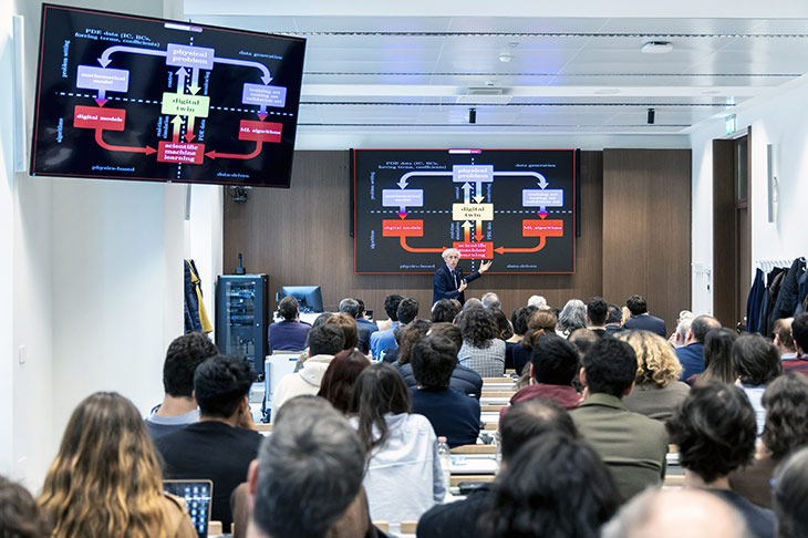 Il professor Quarteroni, forte della sua esperienza nella matematica applicata - la disciplina che usa la matematica per affrontare problemi concreti - ha descritto in modo semplice l’approccio della scienza computazionale: partire da un fenomeno reale, tradurlo in un modello matematico fatto di equazioni e, attraverso il calcolo numerico, ottenere simulazioni digitali capaci di rappresentarlo e di prevederne il comportamento. Da qualche anno a tale approccio, ha continuato, se ne è aggiunto un altro: quello guidato dai Big data, usati per addestrare algoritmi che imparano in modo autonomo e formulano risposte - molto più velocemente - senza applicare alcun risultato teorico. Perché allora non immaginare questi due approcci insieme?