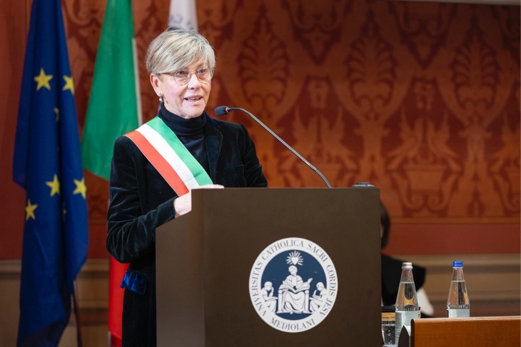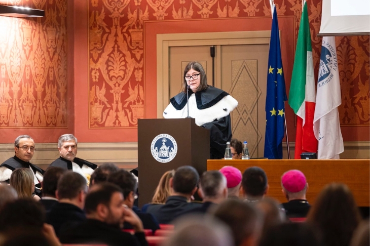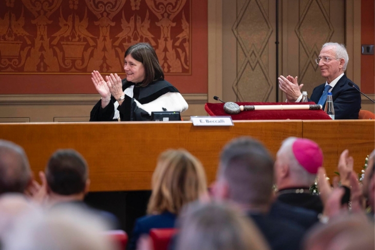 Nel concludere il suo discorso il Rettore ha indicato una luminosa figura di riferimento per la comunità universitaria, quella della bresciana Laura Bianchini, madre costituente, parlamentare, insegnante e due volte laureata nell’Ateneo fondato da padre Gemelli, cui la sede di Brescia dedicherà un’aula il 2 giugno. «Nelle sue parole» ha concluso la professoressa Beccalli, «troviamo il cuore dell’alleanza tra generazioni e del nostro metodo educativo: accompagnare ogni studentessa e studente a scoprire la sua vocazione e, al tempo stesso, a riconoscere le sue responsabilità verso gli altri, consapevoli che tutto ciò matura dentro una rete di relazioni autentiche e condivise».