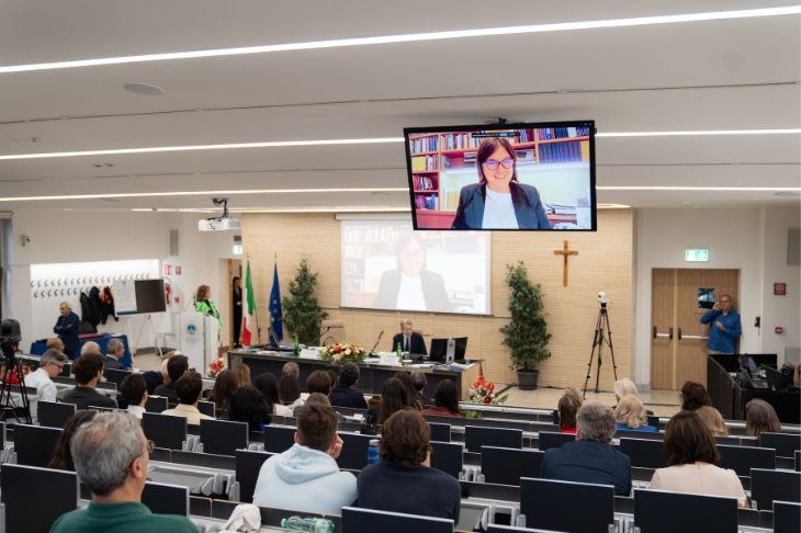 «Homeland: Patria. È la parola più ricorrente nei discorsi e negli studi dei nostri studenti e Alumni in questi sette anni di International Program – ha concluso Federica Olivares, rivolgendosi ai nuovi diplomati -. Una casa lontano da casa: qui, all’Università Cattolica, non si sono sentiti più stranieri, ma parte di una speranza comune basata su valori condivisi. E questa grande parola, patria, è stata ed è pronunciata da giovani provenienti da Siria, Iran, Iraq, Sudan, Etiopia, Ucraina, Kosovo, Serbia, Georgia e, ancora, da altri Paesi in cinque continenti: soprattutto per questo siamo convinti del lavoro e della missione di questo International Program and Master. Ed è per questo che vi siamo grati, insieme alle vostre famiglie, per aver scelto di studiare con noi in questi anni e di rendere un sogno possibile».