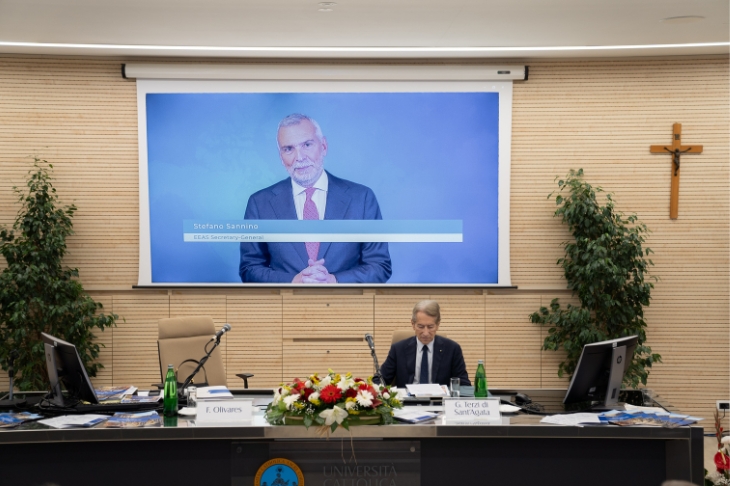 Al centro della prima parte dell’evento il Keynote Speech dell’Ambasciatore Stefano Sannino, Segretario Generale dell’EEAS, attraverso un videomessaggio inviato dalla sede di Bruxelles: «Ringrazio l’Università Cattolica per la firma di questo Memorandum of Understanding che sarà la base per una nuova formazione, solida e strategica, dei nostri manager e per l’alto valore promosso dall’International Program in Public and Cultural Diplomacy» - diretto da Federica Olivares che è stata ora nominata Special Adviser to EEAS for EU Public Diplomacy, NdR – così l’Ambasciatore Sannino aprendo il suo messaggio ai presenti.