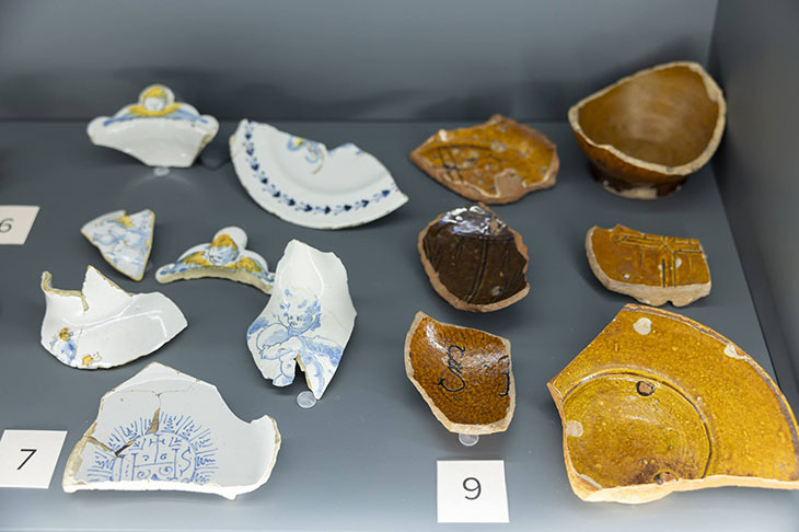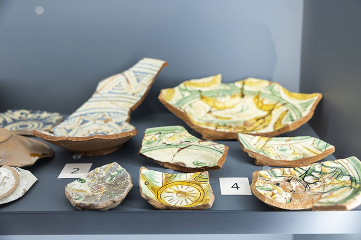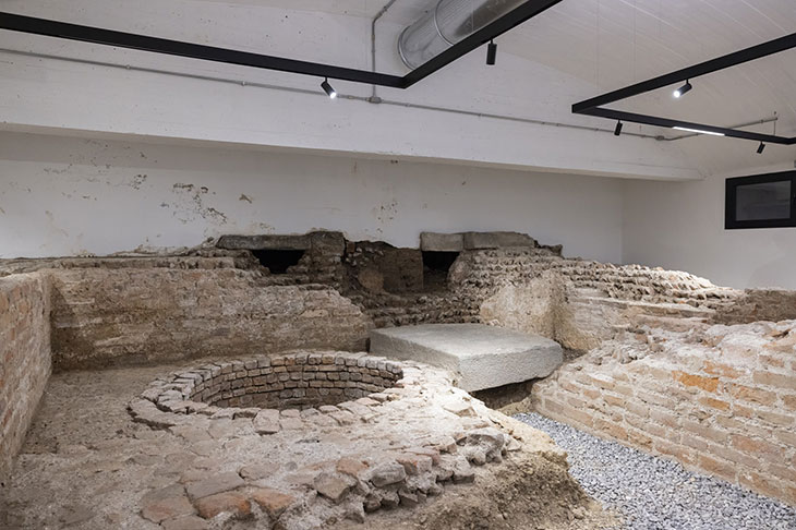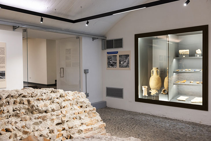 Nello spazio espositivo sottostante la libreria Brioschi si possono ammirare in apposite vetrine reperti ceramici, iscrizioni e altri materiali, perfettamente conservati che documentano i principali momenti che hanno interessato l’evoluzione del sito: la prima età imperiale romana, l’età paleocristiana con la costruzione dei monumenti funerari, l’età rinascimentale con la presenza del Monastero delle Convertite di Santa Valeria, che ha ospitato anche la monaca di Monza.
