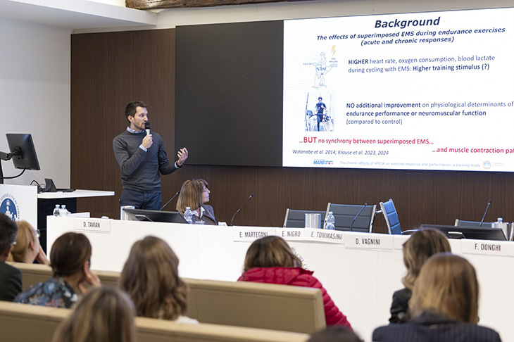 Rossella Dodi, membro del comitato scientifico del Cribens, ha trattato il tema del Ruolo della nutrizione nei giovani atleti: conoscenze nutrizionali, aderenza alla dieta mediterranea e rischio di Relative Energy Deficiency nello sport, Federico Donghi, Responsabile Training Department del Centro Ricerche Mapei Sport, di quello degli Effetti dell’esercizio di pedalata con elettrostimolazione sulle risposte fisiologiche e percettive in giovani adulti.