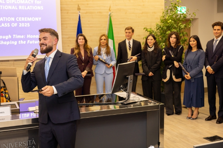 «Il Master in Advanced Public and Cultural Diplomacy è stato fondamentale per le mie aspirazioni professionali - ha commentato a margine della cerimonia Manuel Enrique Andrade, FEPORT Policy Advisor. - Mi ha fornito un'istruzione di livello, la sicurezza derivante dalla capacità di collegare le conoscenze teoriche con l'applicazione pratica, un ambiente distintivo in cui gli studenti interagivano regolarmente con direttori, ambasciatori e responsabili politici di alto livello, e un approccio personalizzato ai tirocini, che ha segnato l'inizio della mia carriera. Oggi ricopro il ruolo di consulente politico per la Federazione dei Porti e Terminal Europei (FEPORT) a Bruxelles, rappresentando gli interessi degli operatori portuali e terminalistici europei. Questo ruolo mi permette di contribuire in modo significativo al settore, sentendomi apprezzato e soddisfatto nel mio lavoro».
