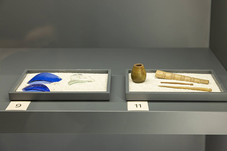 Nello spazio espositivo sottostante la libreria Brioschi si possono ammirare in apposite vetrine reperti ceramici, iscrizioni e altri materiali, perfettamente conservati che documentano i principali momenti che hanno interessato l’evoluzione del sito: la prima età imperiale romana, l’età paleocristiana con la costruzione dei monumenti funerari, l’età rinascimentale con la presenza del Monastero delle Convertite di Santa Valeria, che ha ospitato anche la monaca di Monza.