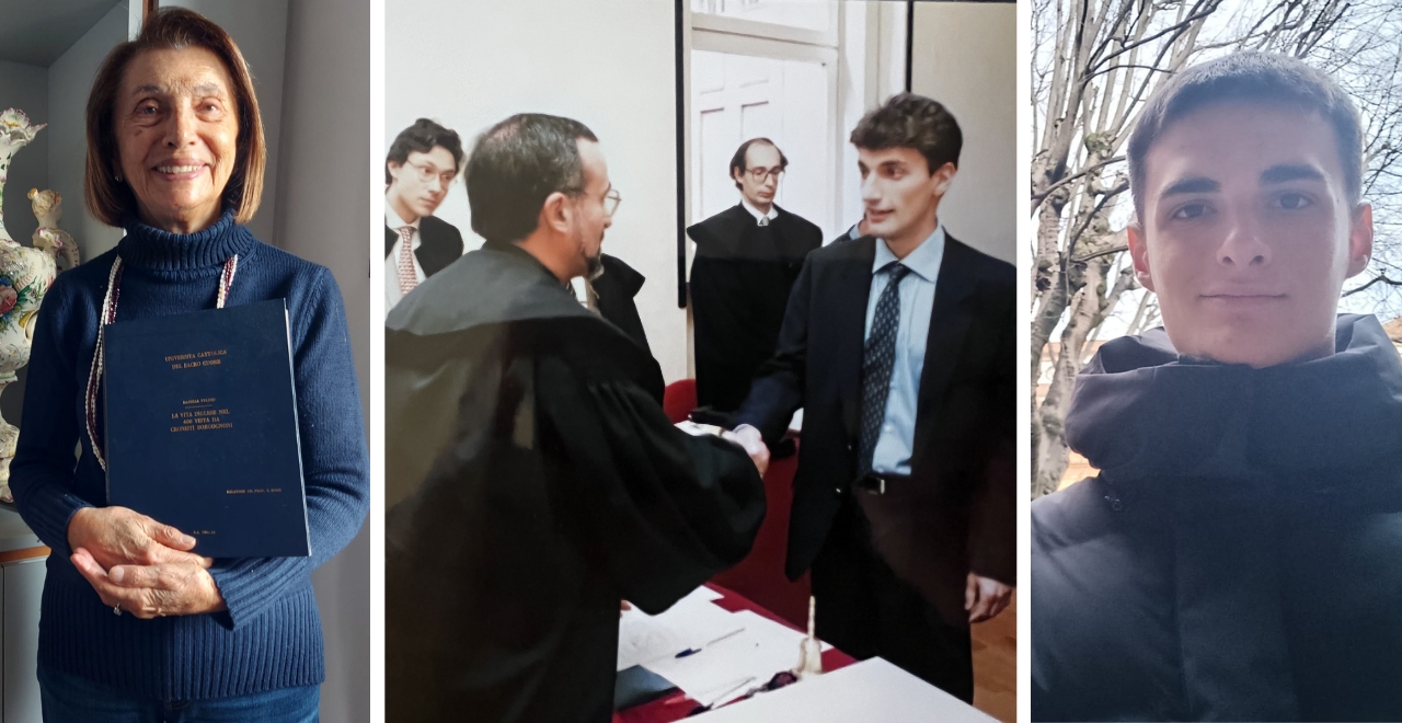 Magistero, Economia, Lettere. Hanno studiato in Facoltà diverse e in anni differenti ma tutti e tre, Daniela, Marco ed Elia, sono molto soddisfatti di aver scelto l’Università Cattolica. Tre generazioni raccontano la loro esperienza nell’Ateneo di Largo Gemelli, dai ricordi di studi rigorosi e professori stimolanti dei laureati Daniela e Marco - oggi orgogliosi di far parte della grande Community Alumni - all’entusiasmo di Elia che in Cattolica ha trovato corsi interessanti che soddisfano tutte le sue aspettative di giovane matricola.