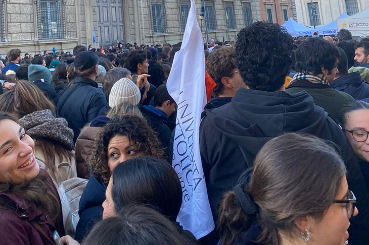 Fra loro oltre cento studentesse e studenti del campus di Roma dell’Università Cattolica del Sacro Cuore, accompagnati da assistenti pastorali e responsabili dei Collegi, accorsi in Piazza San Pietro per vivere ancora una volta, dopo il grande Giubileo dei Giovani dell’estate scorsa, un intenso momento di gioia e di comunità.