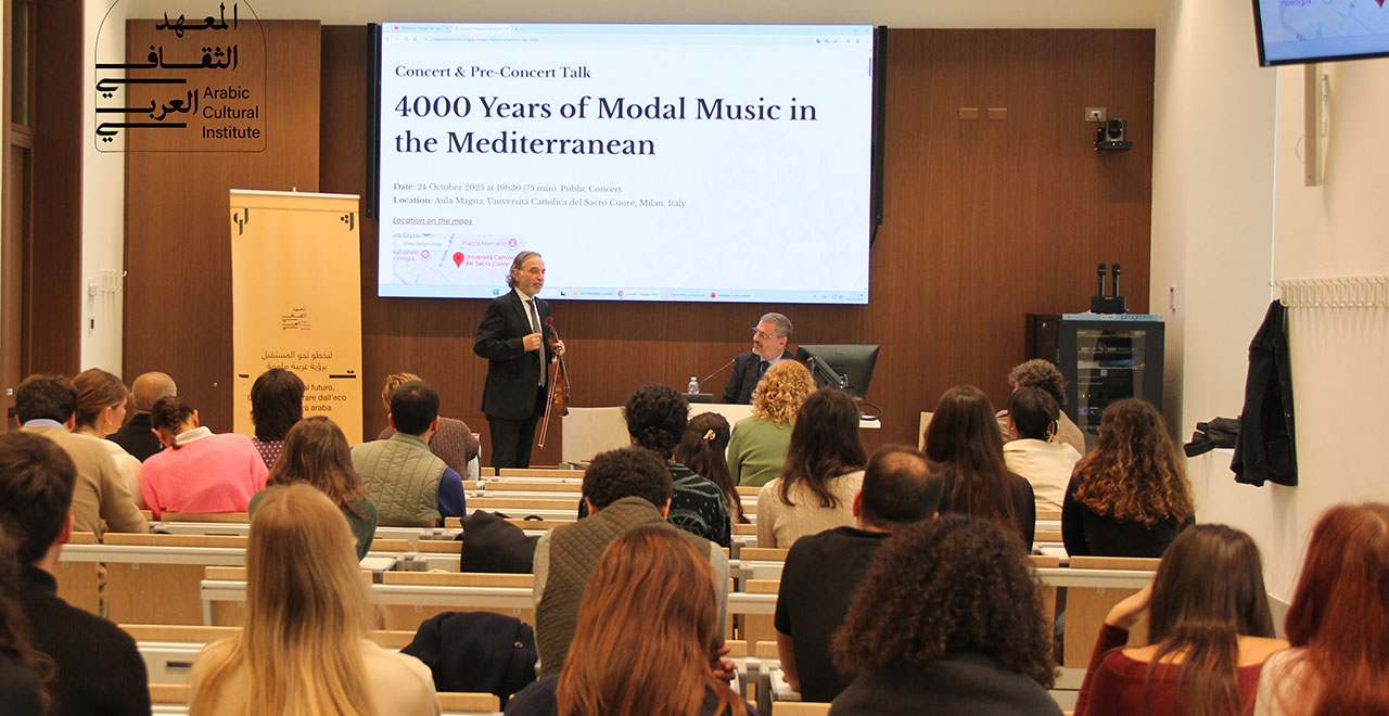 L’Aula Magna del campus milanese dell’Ateneo ha accolto in serata un suggestivo concerto di musica modale, con la partecipazione di Nidaa Abou Mrad (kemāntšē, viella e violino), di Tarik Beshir (canto e oud), Rafka Rizk (canto) e Ghassan Sahhab (qānūn e lira). Si è trattato di un vero e proprio viaggio musicale in sette tappe, una per ciascuna epoca storica e regione del Mediterraneo: dalla melodia più antica al mondo, incisa su una tavoletta di Ugarit (Siria), alla Grecia antica, ai canti cristiani medievali delle chiese siriaca, copta e bizantina, al canto gregoriano latino, alle composizioni di Ṣafī al-Dīn al-Urmawī, grande teorico musicale dell’epoca abbaside, e ai versi mistici di Muḥyī al-Dīn Ibn ʿArabī. Il viaggio ha poi toccato il Maghreb, l’Andalusia, la Spagna e i versi di Dante Alighieri, per concludersi infine in Egitto, nel pieno della Nahda, il Rinascimento arabo del XIX secolo, con una selezione di musica sufi.